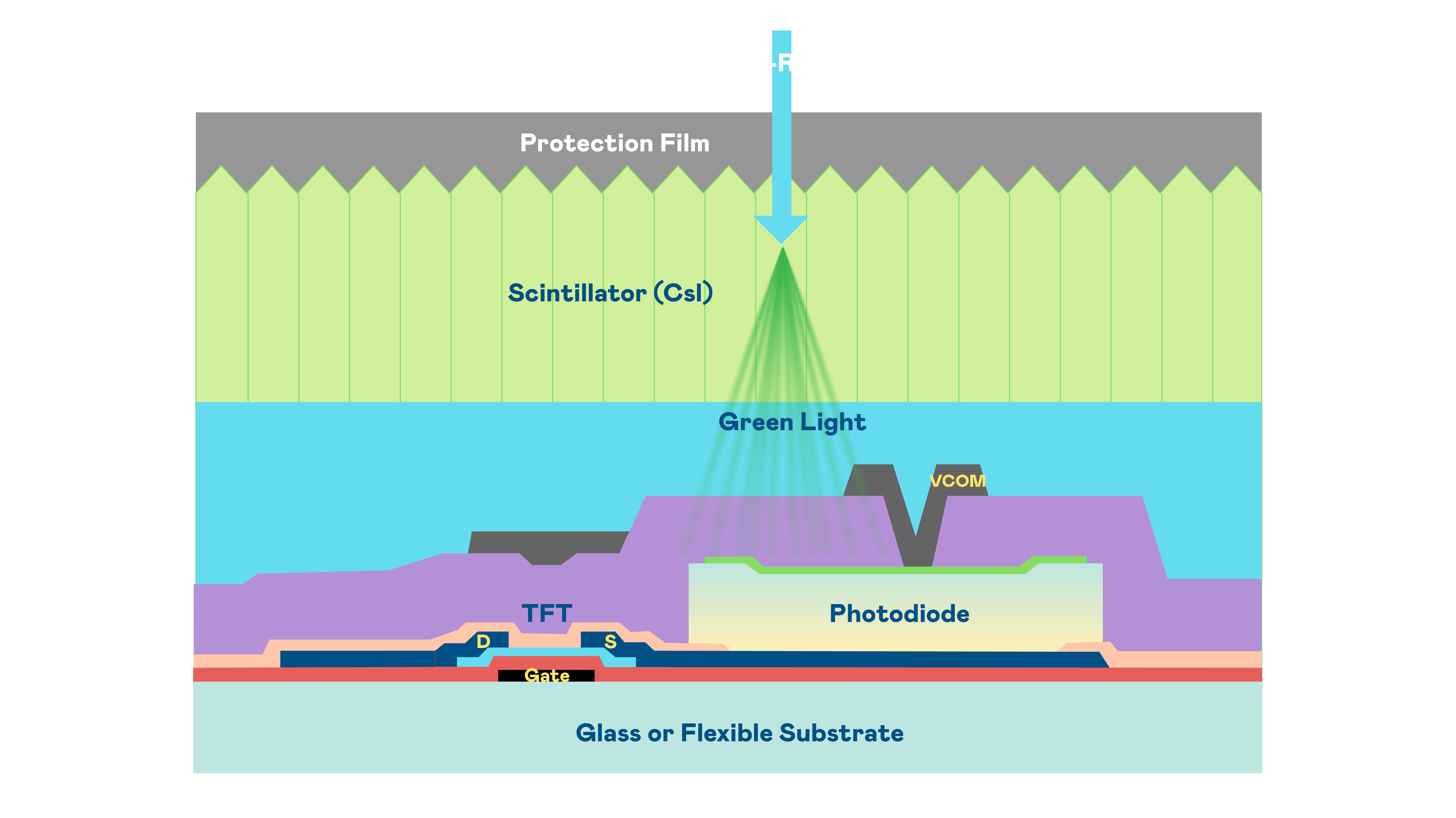 BG视讯的X光影像感测阵列使用薄膜电晶体 (TFT) 作为每个像素的读取开关,搭配光电二极体(Photodiode)的光电转换元件,用以感测X光影像讯号。